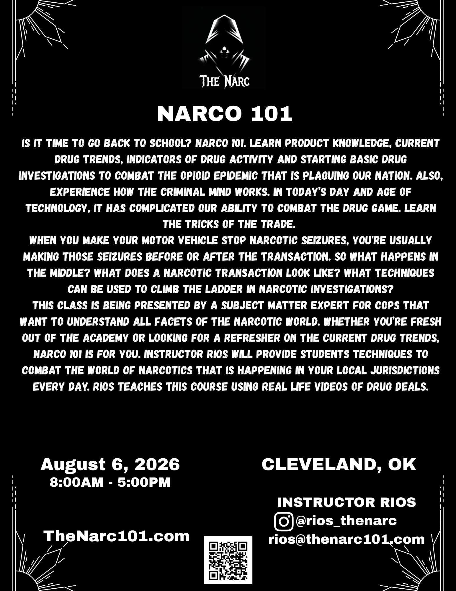 Is it time to go back to school? Narco 101. Learn product knowledge, current drug trends, indicators of drug activity and starting basic drug investigations to combat the opioid epidemic that is plaguing our nation. Also, experience how the criminal mind works. In today’s day and age of technology, it has complicated our ability to combat the drug game. Learn the tricks of the trade.