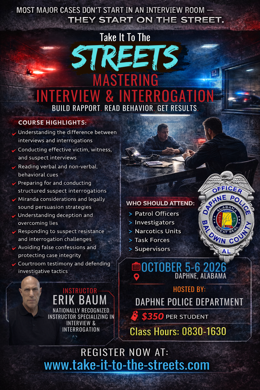 This course moves beyond outdated, traditional interview techniques and focuses on what actually works in today’s environment. Officers will learn how to build rapport, read human behavior, and influence outcomes from the very first point of contact through formal interrogation. Whether during roadside encounters, narcotics investigations, or high-stakes criminal cases, students will develop a structured, ethical, and legally sound approach to communication that strengthens cases, enhances officer safety, and improves investigative results.