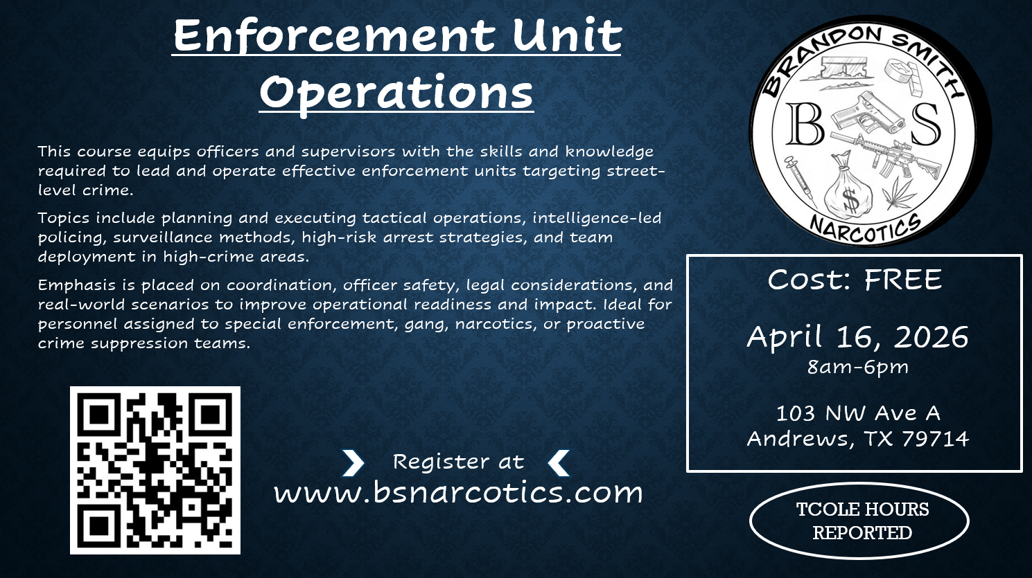 This course equips officers and supervisors with the skills and knowledge required to lead and operate effective enforcement units targeting street-level crime. Topics include planning and executing tactical operations, intelligence-led policing, surveillance methods, high-risk arrest strategies, and team deployment in high-crime areas. Emphasis is placed on coordination, officer safety, legal considerations, and real-world scenarios to improve operational readiness