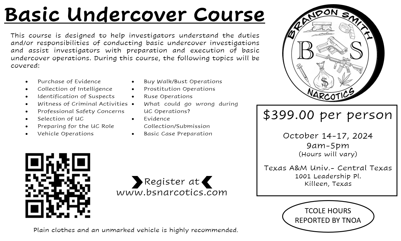 THIS COURSE IS DESIGNED TO HELP INVESTIGATORS UNDERSTAND THE DUTIES AND/OR RESPONSIBILITIES OF CONDUCTING BASIC UNDERCOVER INVESTIGATIONS AND ASSIST INVESTIGATORS WITH THE PREPARATION AND EXECUTION OF BASIC UNDERCOVER OPERATIONS. WHILE THIS COURSE DOES HAVE CLASSROOM INSTRUCTION, IT CONCENTRATES IN HANDS-ON, SCENARIO BASED TRAINING TECHNIQUES.