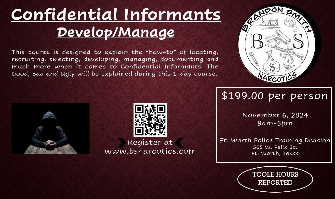 This course is designed to explain the “how-to” of locating, recruiting, selecting, developing, managing, documenting and much more when it comes to Confidential Informants. The Good, Bad and Ugly will be explained during this 1-day course.