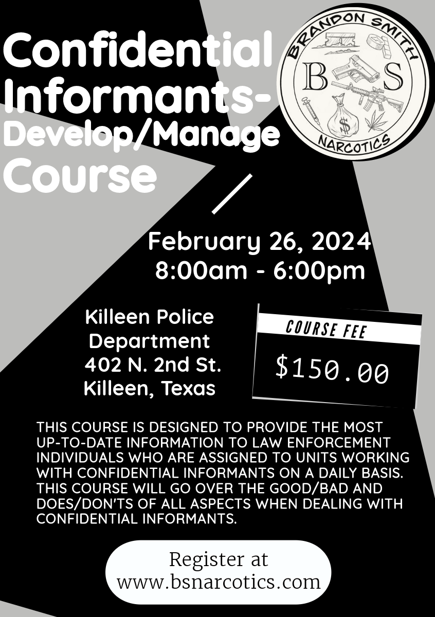 THIS COURSE IS DESIGNED TO PROVIDE THE MOST UP-TO-DATE INFORMATION TO LAW ENFORCEMENT/MILITARY INDIVIDUALS WHO ARE ASSIGNED TO UNITS WORKING WITH CONFIDENTIAL INFORMANTS ON A DAILY BASIS. THIS COURSE WILL GO OVER THE GOOD/BAD AND DOES/DON'TS OF ALL ASPECTS WHEN DEALING WITH CONFIDENTIAL INFORMANTS.