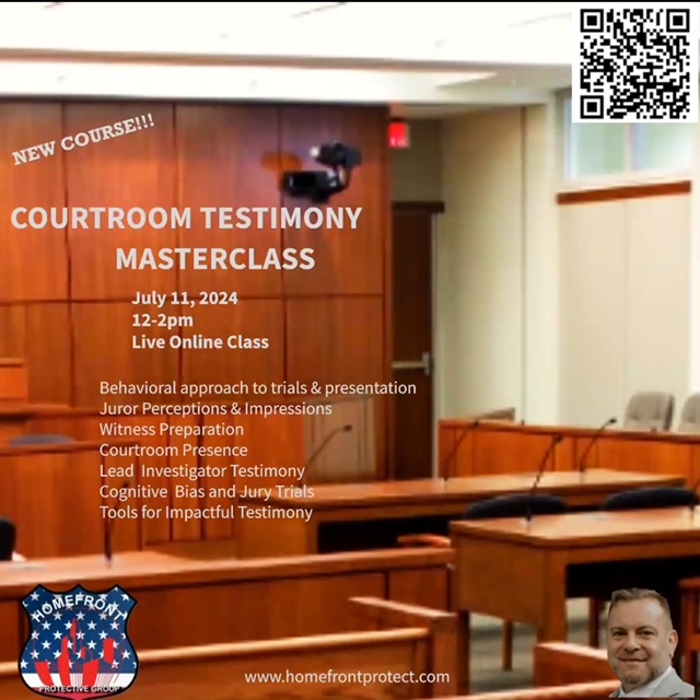This course talks about human behavior, and cognitive psychology and applies them to courtroom presence and testimony. It will also focus on perceptual illusions, psychology of appearance, preparation, and impressions to enhance information delivery and courtroom success. Finishing your investigation strong in court/trial is paramount to ensuring justice is served and victims receive closure. This is a new course that takes a psychological approach to provide the st