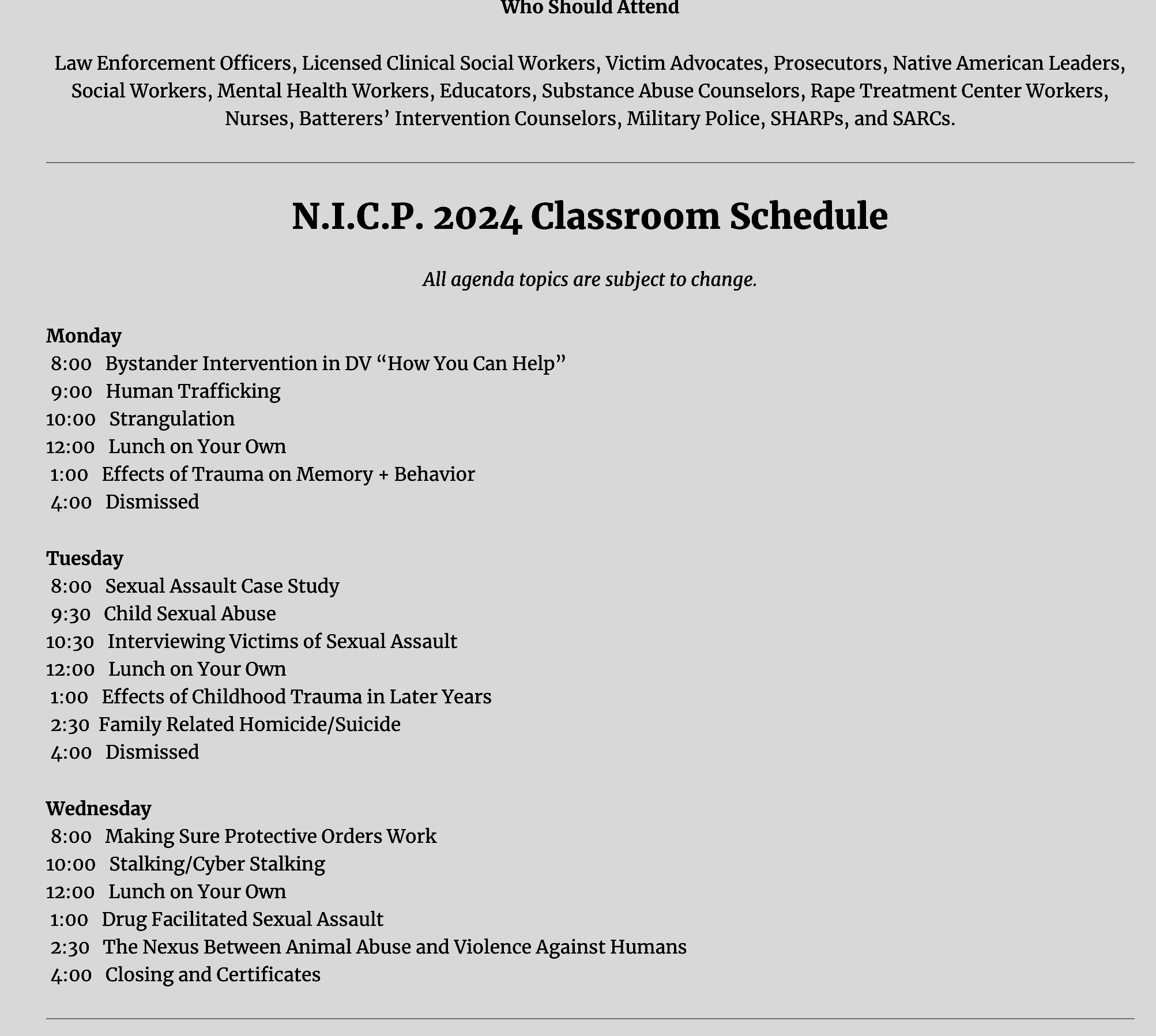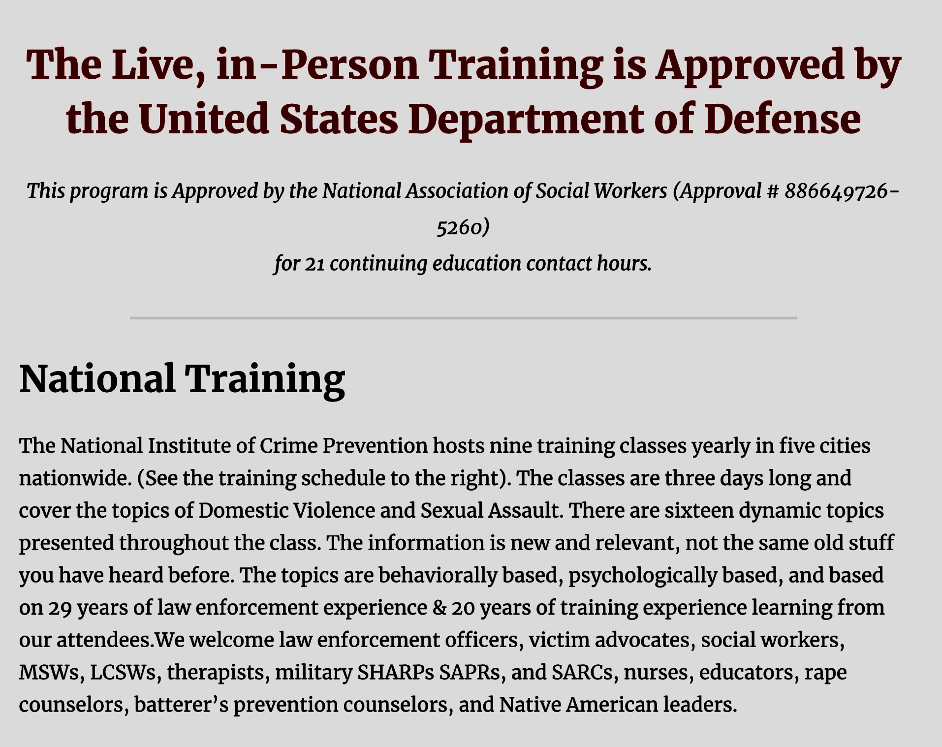 The classes are three days long and cover the topics of Domestic Violence and Sexual Assault. There are sixteen dynamic topics presented throughout the class. The information is new and relevant, not the same old stuff you have heard before. The topics are behaviorally based, psychologically based, and based on years of law enforcement experience & training experience learning from our attendees. Training is open to all professions.