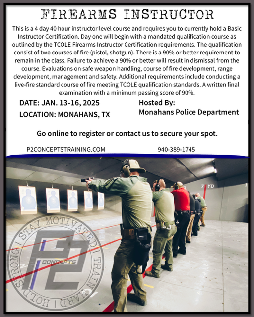 This is a 4 day 40 hour instructor level course and requires you to currently hold a Basic Instructor Certification. Evaluations on safe weapon handling, course of fire development, range development, management and safety. Additional requirements include conducting a live-fire standard course of fire meeting TCOLE qualification standards.