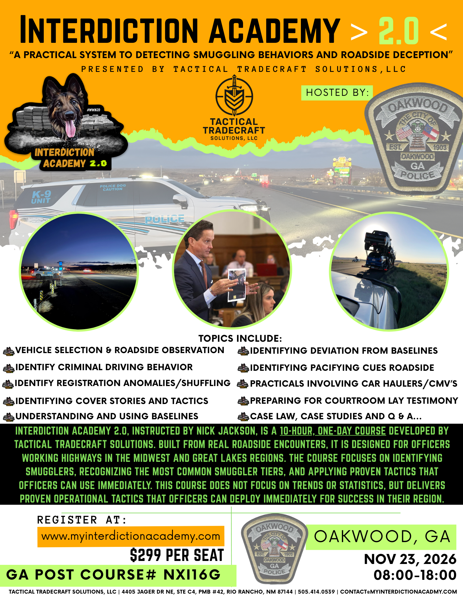 Interdiction Academy 2.0 is an advanced training course designed to refine and expand interdiction skills for professionals in law enforcement and related fields. Participants will build upon foundational tactics to identify criminal behavior, concealment methods, and deceptive indicators during encounters. Through hands-on practicals, real-world case studies, and scenario-based learning, students will strengthen their ability to detect, assess, and disrupt criminal activity with precision and confidence. Upon successful completion of the course, participants will receive a certificate recognizing their advanced interdiction training and practical proficiency.