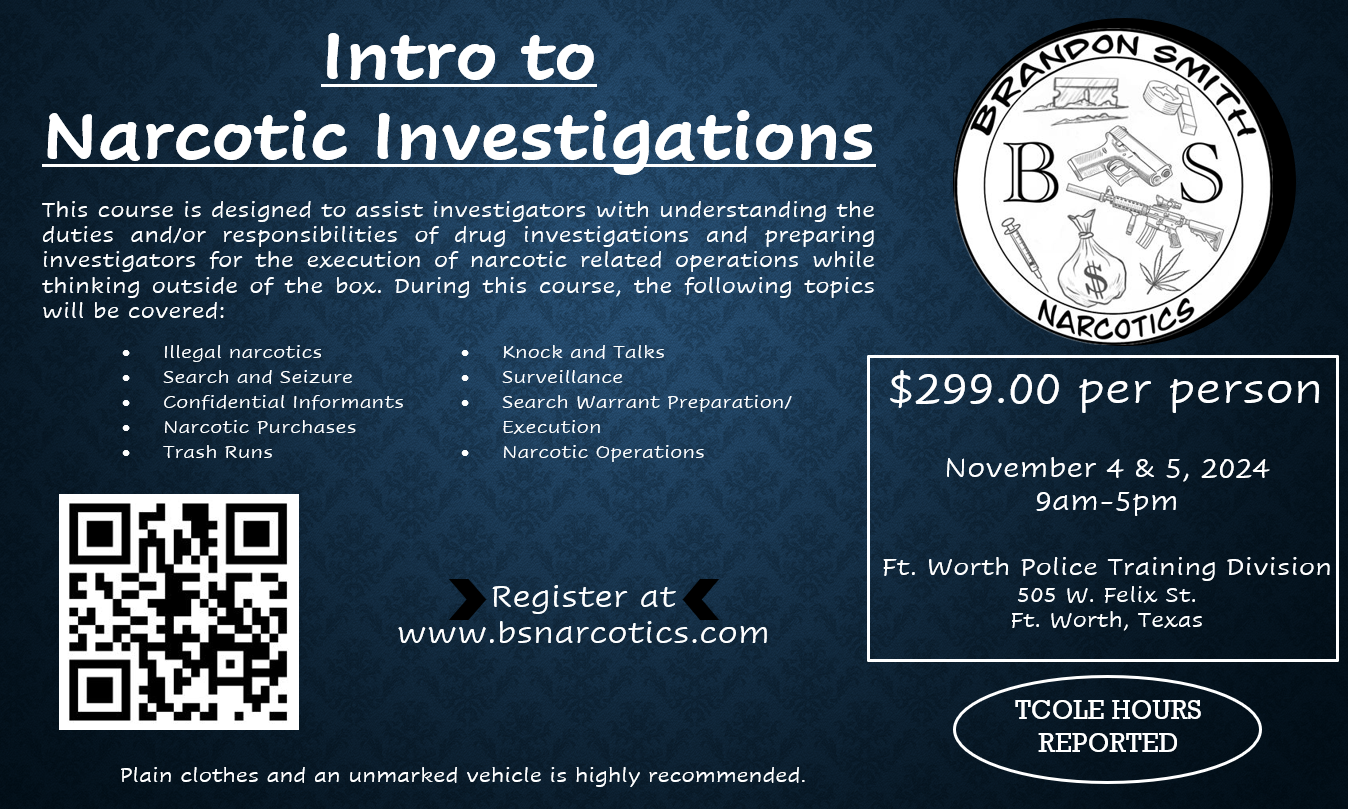 This course is designed to assist investigators with understanding the duties and/or responsibilities of drug investigations and preparing investigators for the execution of narcotic related operations while thinking outside of the box.