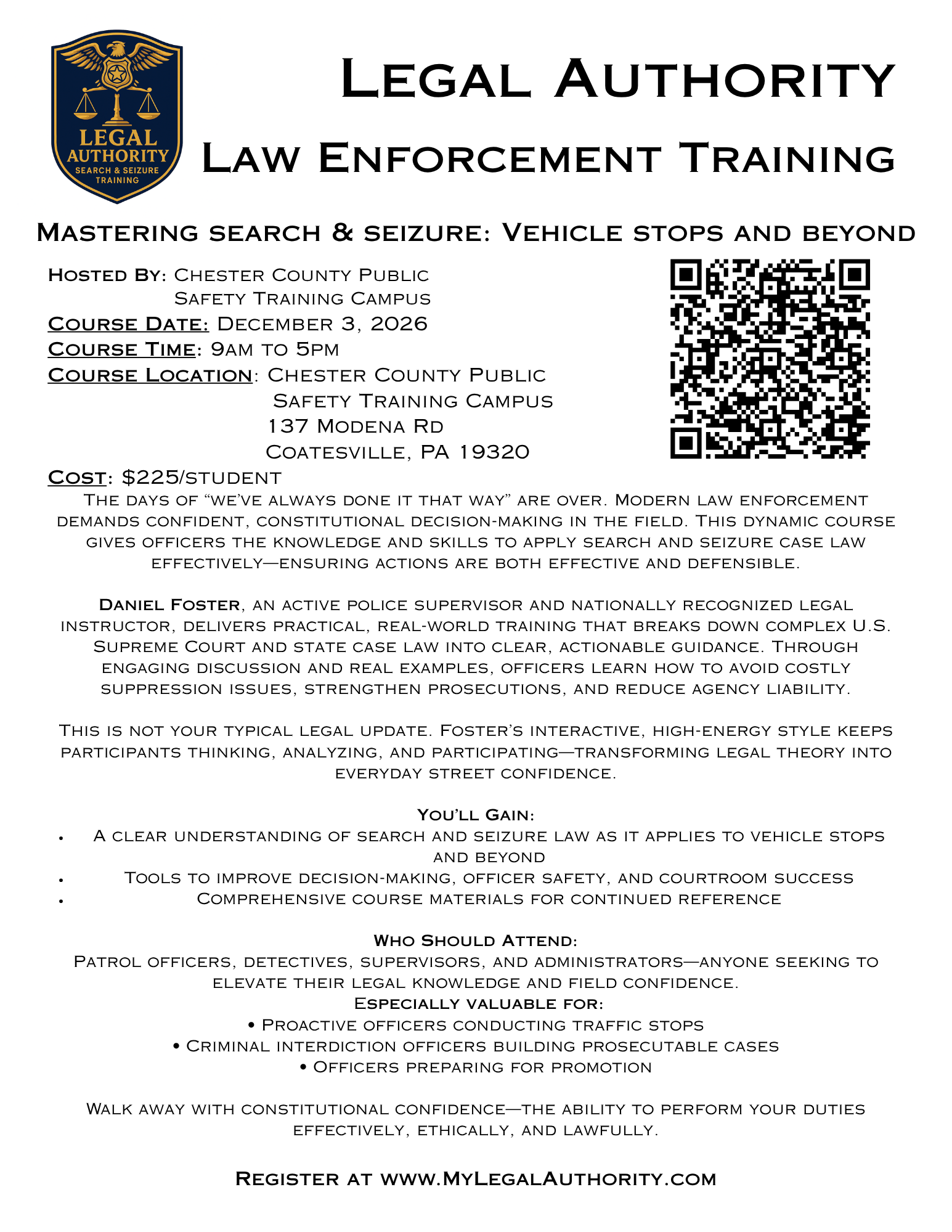 The era of relying on “we’ve always done it that way” is over. In today’s climate, law enforcement professionals must be confident in their understanding of what the courts have deemed lawful and constitutional. This course, Mastering Search & Seizure: Vehicle Stops and Beyond, equips officers with the knowledge and skills to apply case law effectively in the field—ensuring their actions are not only effective but also defensible.