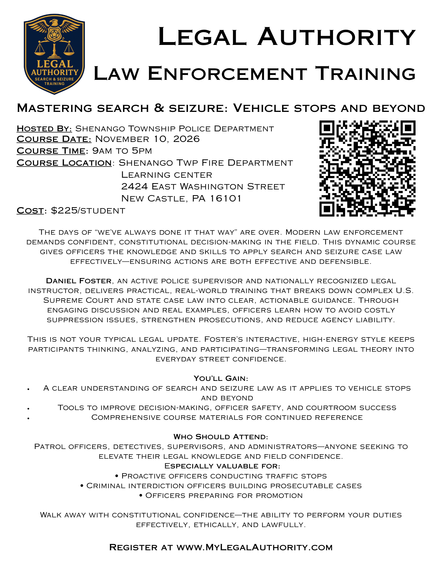The era of relying on “we’ve always done it that way” is over. In today’s climate, law enforcement professionals must be confident in their understanding of what the courts have deemed lawful and constitutional. This course, Mastering Search & Seizure: Vehicle Stops and Beyond, equips officers with the knowledge and skills to apply case law effectively in the field—ensuring their actions are not only effective but also defensible.