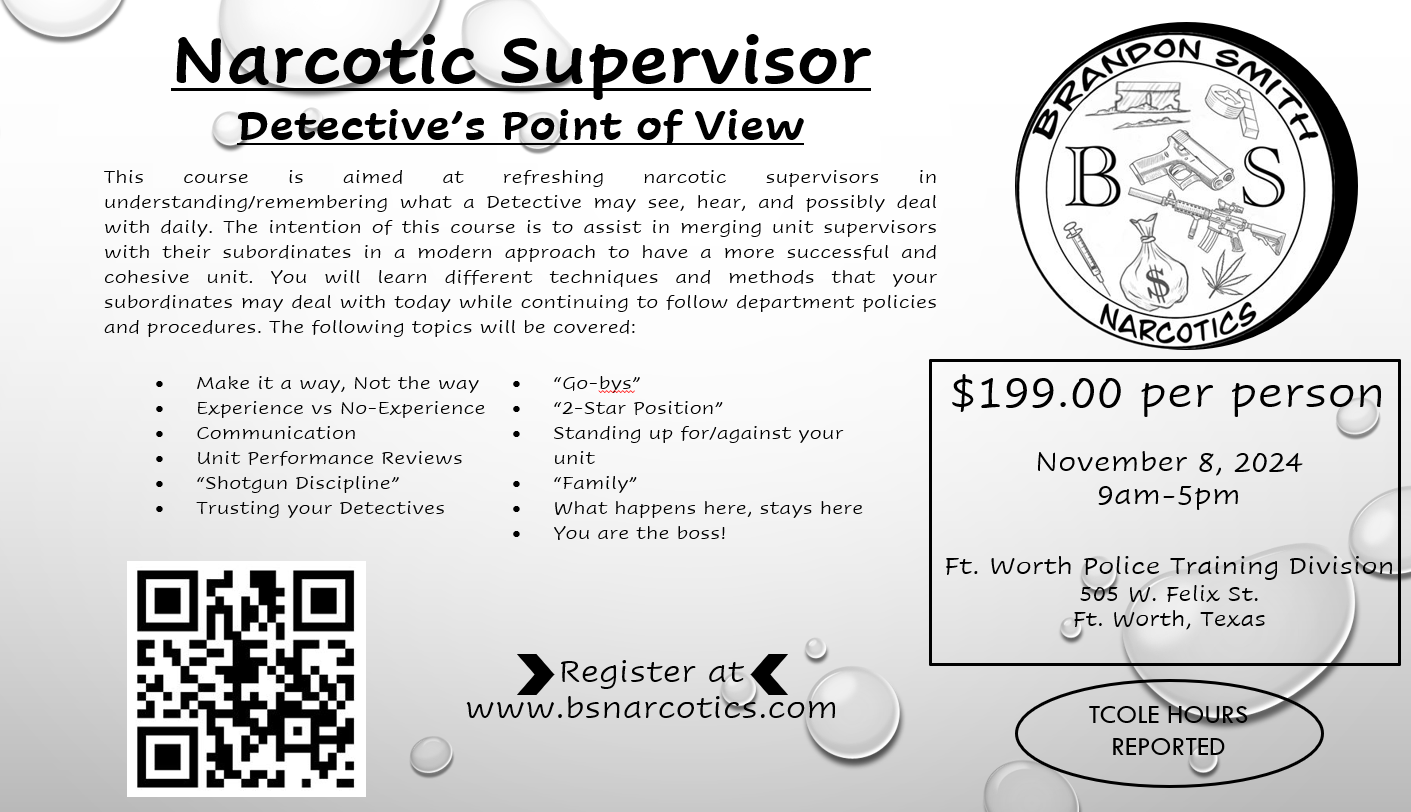 This course is aimed at refreshing narcotic supervisors in understanding/remembering what a Detective may see, hear, and possibly deal with daily. The intention of this course is to assist in merging unit supervisors with their subordinates in a modern approach to have a more successful and cohesive unit. You will learn different techniques and methods that your subordinates may deal with today while continuing to follow department policies and procedures.