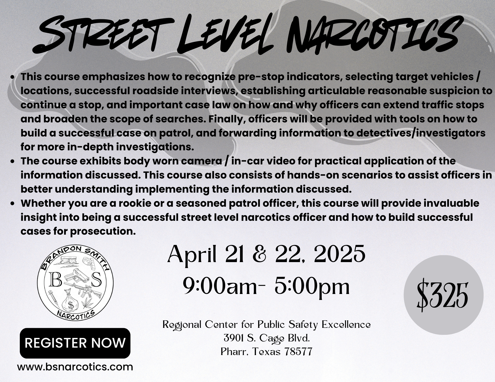 This course emphasizes how to recognize pre-stop indicators, selecting target vehicles / locations, successful roadside interviews, establishing articulable reasonable suspicion to continue a stop, and important case law on how and why officers can extend traffic stops and broaden the scope of searches. Finally, officers will be provided with tools on how to build a successful case on patrol, and forwarding information to detectives/investigators.