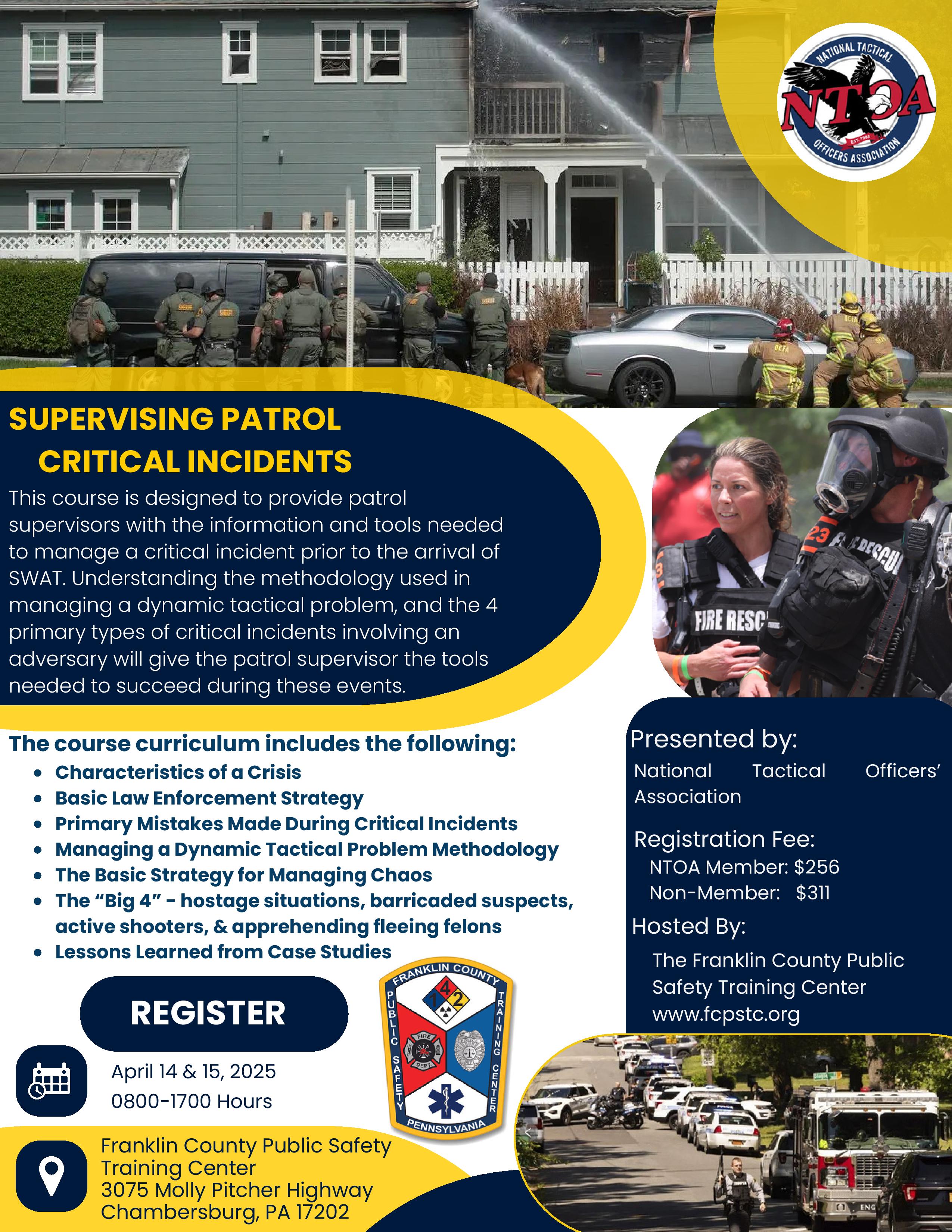 This course is designed to provide patrol supervisors with the information and tools needed to manage a critical incident prior to the arrival of SWAT. Understanding the methodology used in managing a dynamic tactical problem, incident command system fundamentals, and the 4 primary types of critical incidents involving an adversary will give the patrol supervisor the tools needed to succeed during these events.